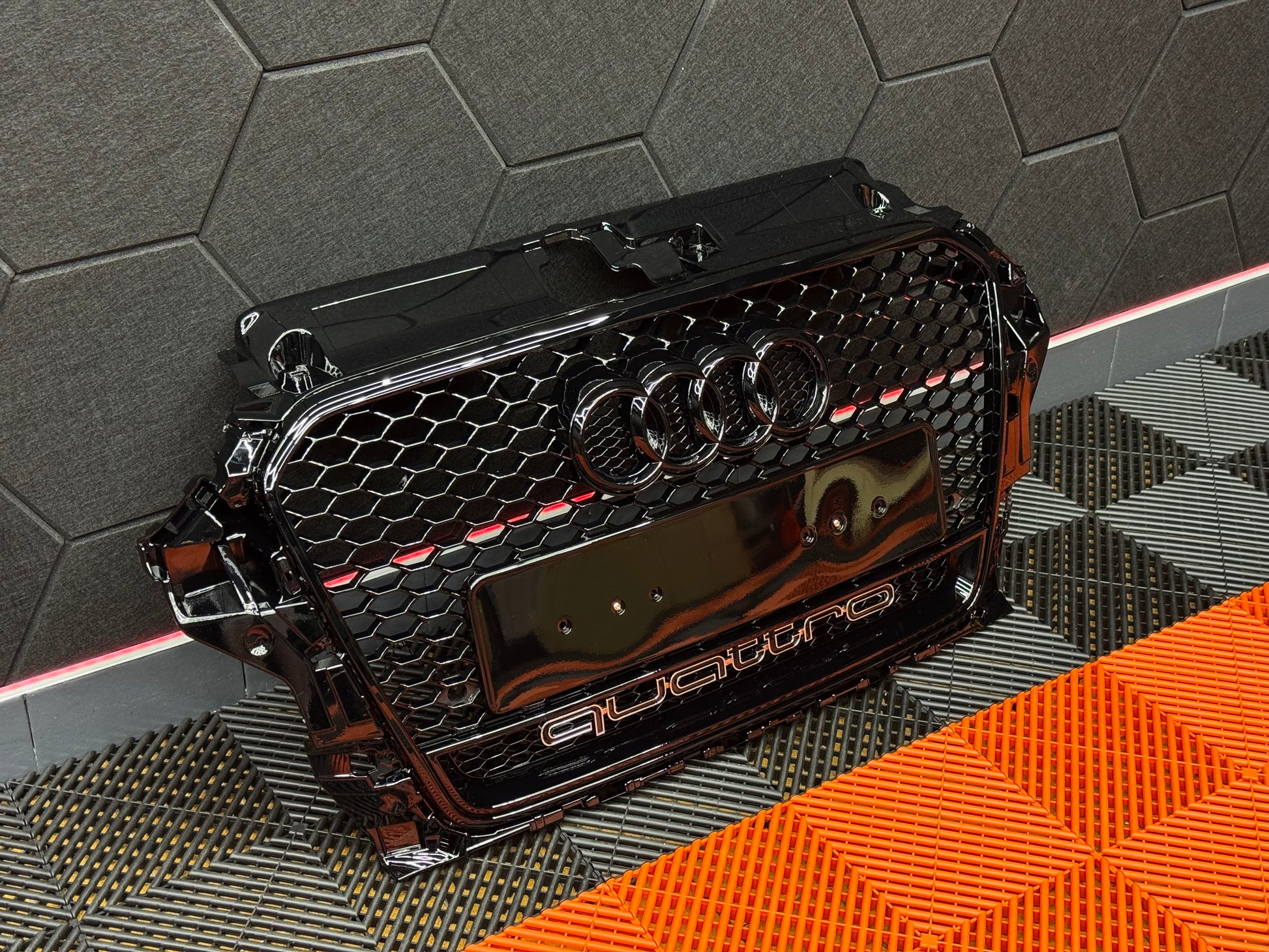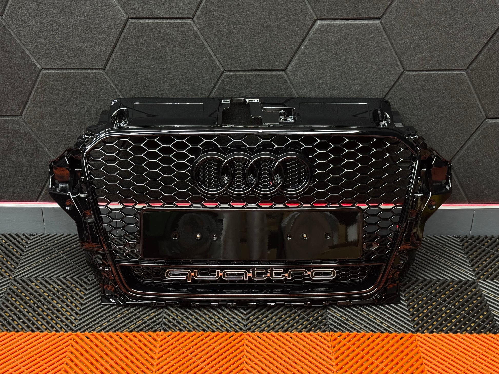 Con logo: Griglia anteriore + coprilogo nido d’ape + logo Audi nero lucido - scritta quattro